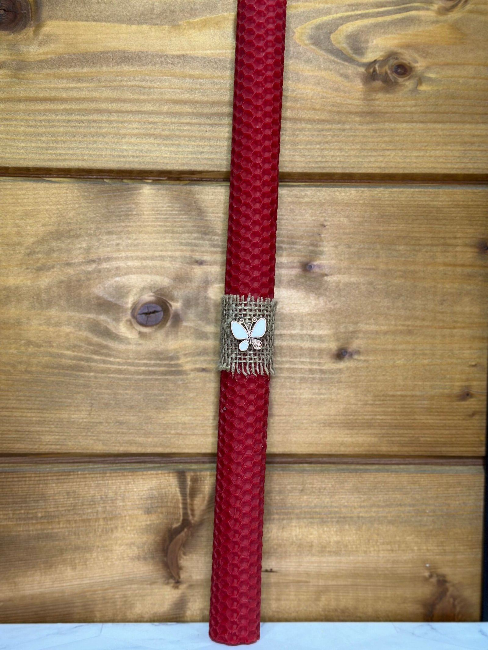 - Φυσικό Υλικό: Φτιαγμένη από αγνό μελισσοκέρι, που χαρίζει απαλή λάμψη και διακριτικό άρωμα.